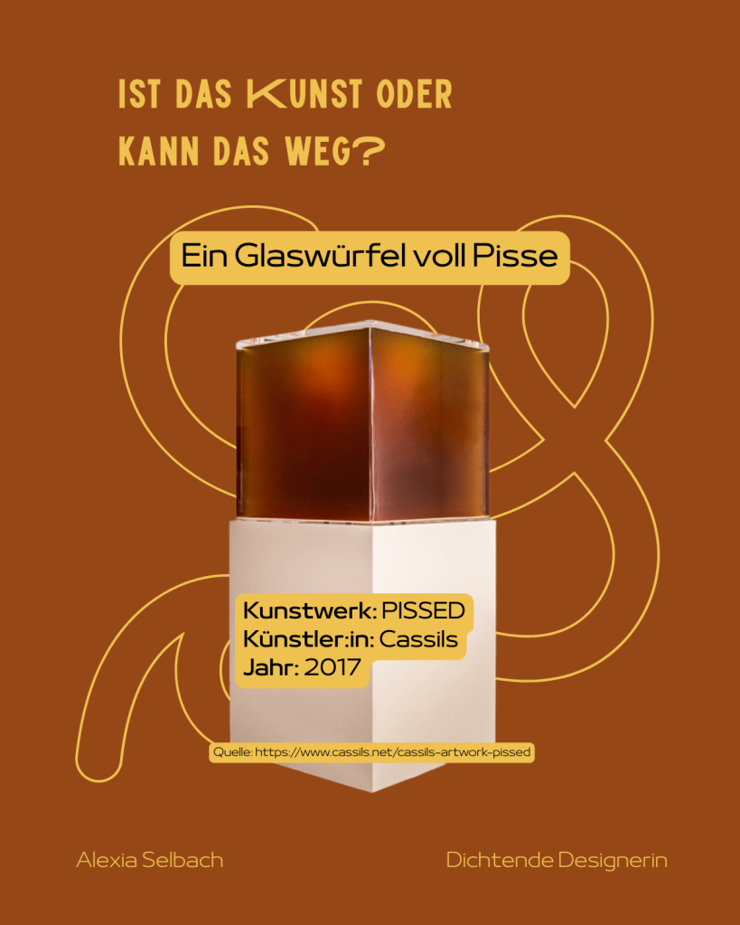 Lass mich dich überzeugen, dass ein Glaswürfel voll Pisse, ein Haufen Bonbons, ein umgedrehtes Urinal und ein Mülleimer voll blutiger Binden und Tampons tatsächlich nicht für die Tonne, sondern Kunst ist. Diese Kunstwerke haben eins gemeinsam: sie provozieren und fordern unser Kunstverständnis heraus. Nehmen wir sie genauer unter die Lupe!