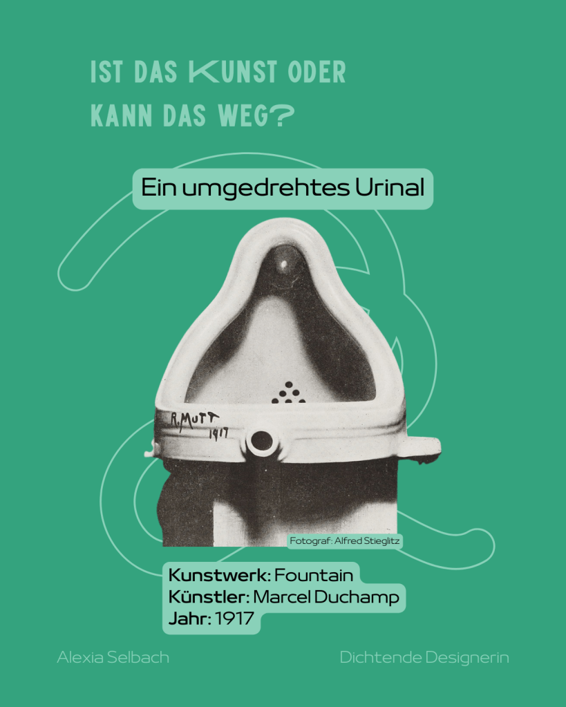 Im Jahr 1917 stellte Marcel Duchamp ein um 90 Grad gekipptes Urinal aus. Seiner ursprünglichen Funktion beraubt und mit einer Künstlersignatur versehen, stellte das Urinal den damaligen Kunstbegriff in Frage. Der Titel suggeriert sogar eine neue Funktion als Brunnen. Es zählt zu der Kunstreihe der Ready-Mades, eine Auswahl an alltäglichen Gegenständen, die allein durch ihre Präsentation zu Kunst werden.
