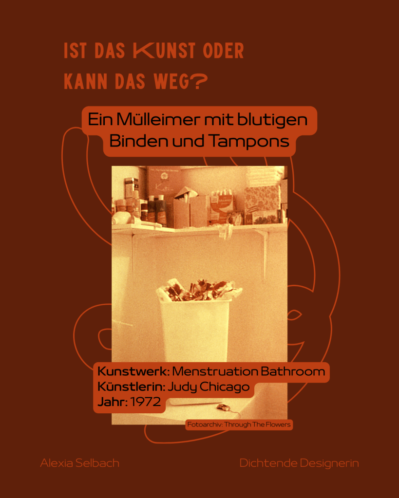 Wie kann ein Mülleimer voller blutiger Binden und Tampons Kunst sein? Es ist ein Anblick, den jede menstruierende Person kennt, doch hinter verschlossenen Türen bleibt. Judy Chicago bricht mit ihrem Werk das Tabu und fordert einen offenen Diskurs über die Monatsblutung. Menstruationsblut als Kunstmaterial wird inzwischen von weiteren Künstler:innen gesammelt, um damit zu malen. Es soll die Menstruation normalisieren und den Betrachtenden den Ekel nehmen.